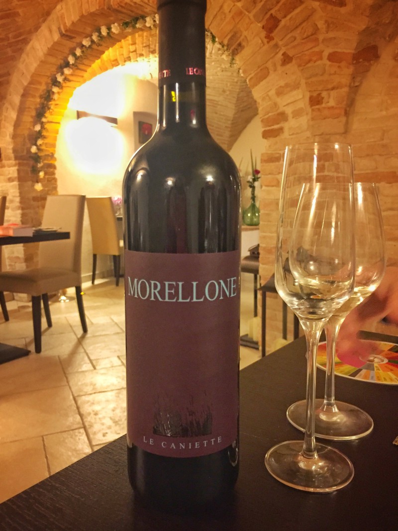 Morellone Rosso Piceno DOC (13,5%) – Le Caniette: un vino della costa, con profumi di ciliegia e mirtillo, perfetto se abbinato con carni grasse come l’anatra. È molto tannico e la sua caratteristica è quella di pulire il palato con la sua acidità. Questo vino è biologico. È buono anche in abbinamento a pasta, pizza e formaggi stagionati.